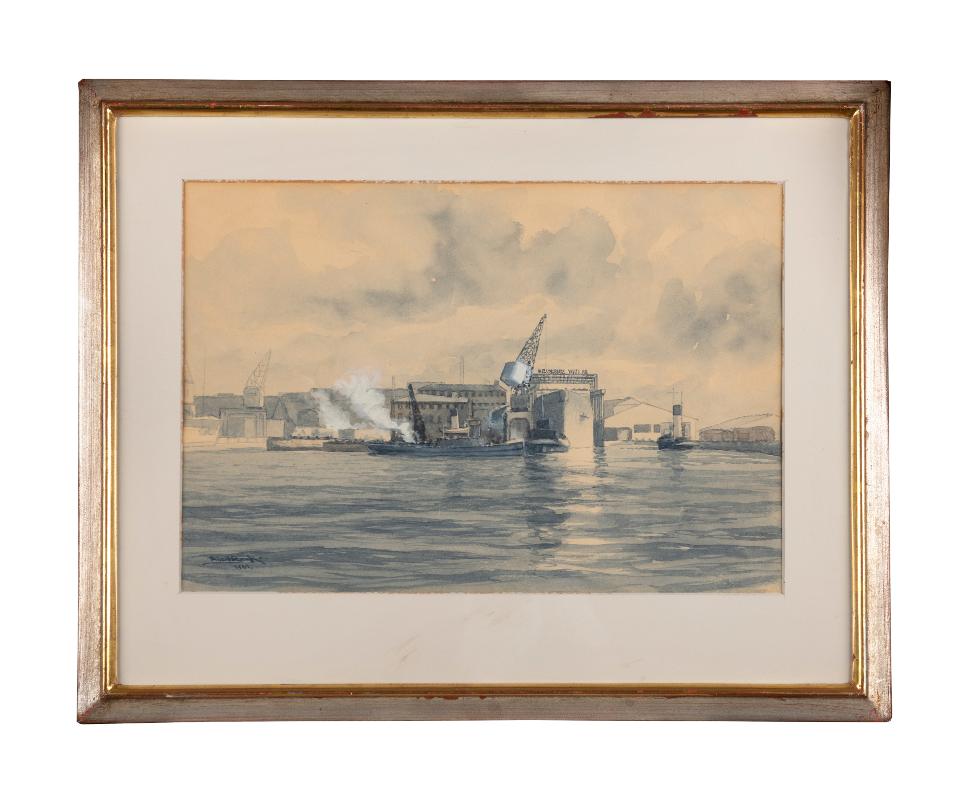• Helsingborgs hamn med Helsingborgs varv. Akvarell, glasad och ramad inom profilerad träram i guld.