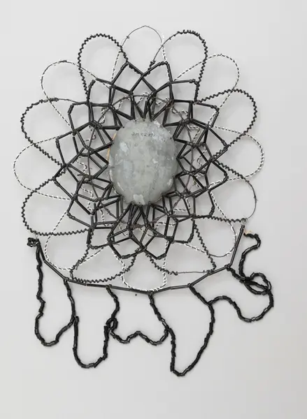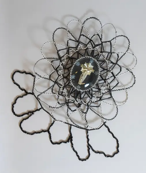 • Pärlkrans, blomformig krans av ståltråd med svarta och vita påträdda pärlor. I kransens mitt sitter en oval sammetsplatta med ett krusifix i vit metall, omgiven av femflikiga blommor av vita pärlor oc... Visa hela