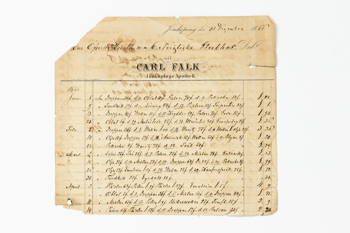 Debiteringsnota, del av, av papper. Från Carl Falk, Jönköpings Apotek, till överstelöjtnant C. Perglicks [?] sterbhus 31 december 1866.
