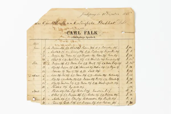Debiteringsnota, apoteksföremål. Gåva av apotekare Åke Martin, Jönköping, 1982. Samtidigt förvärvat: JM.3600-JM.36403, se även JM.22290-JM.22416.