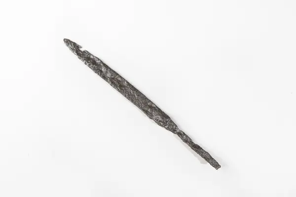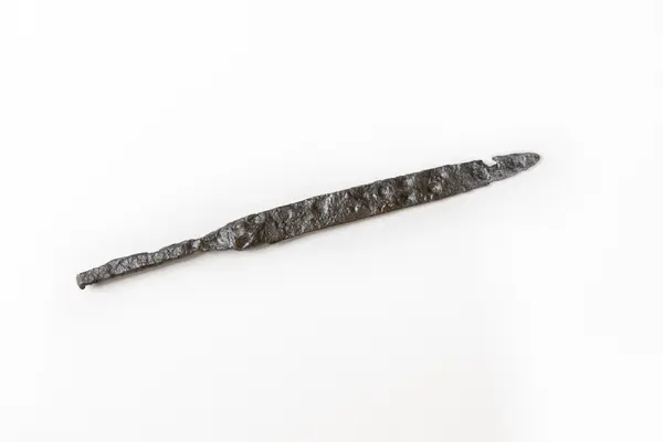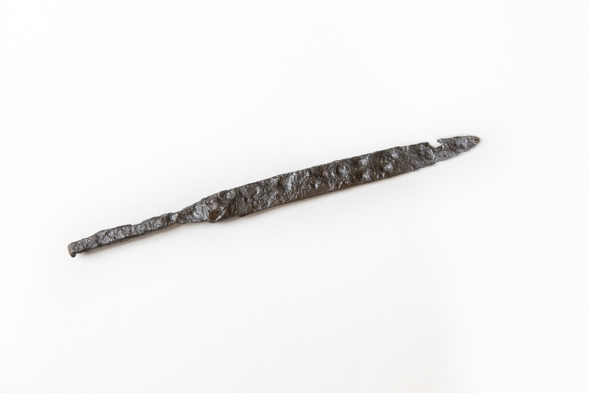 Kniv påträffad vid arkeologisk undersökning av överplöjt vikingatida gravfält i Nennesmo, Reftele socken, Gislaveds kommun, Jönköpings län, utförd av Jönköpings läns museum 1976-1979.