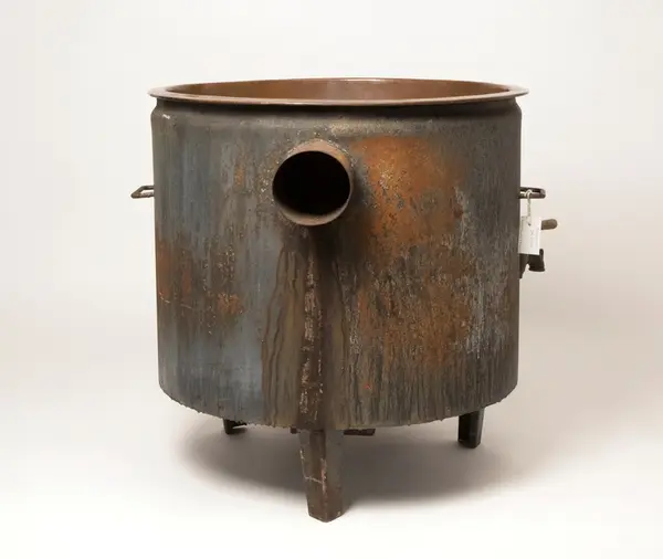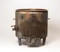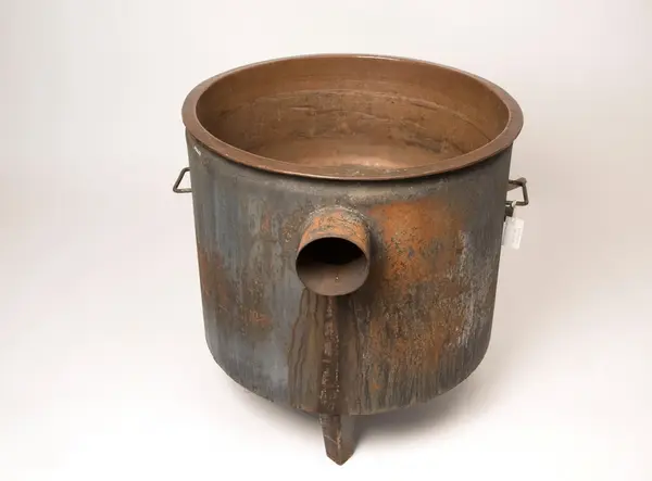 Tvättgryta, vedeldad, av järn med lös kopparkittel med brätte. Grytan står på tre ben. Nedtill på grytan, bakom en luka med hasp, finns eldstaden, och därunder låda för uppsamling av askan. Grytan är försedd med avtappningskran, upptill sitter två handtag, på baksidan finns rör för anslutning av skorsten.