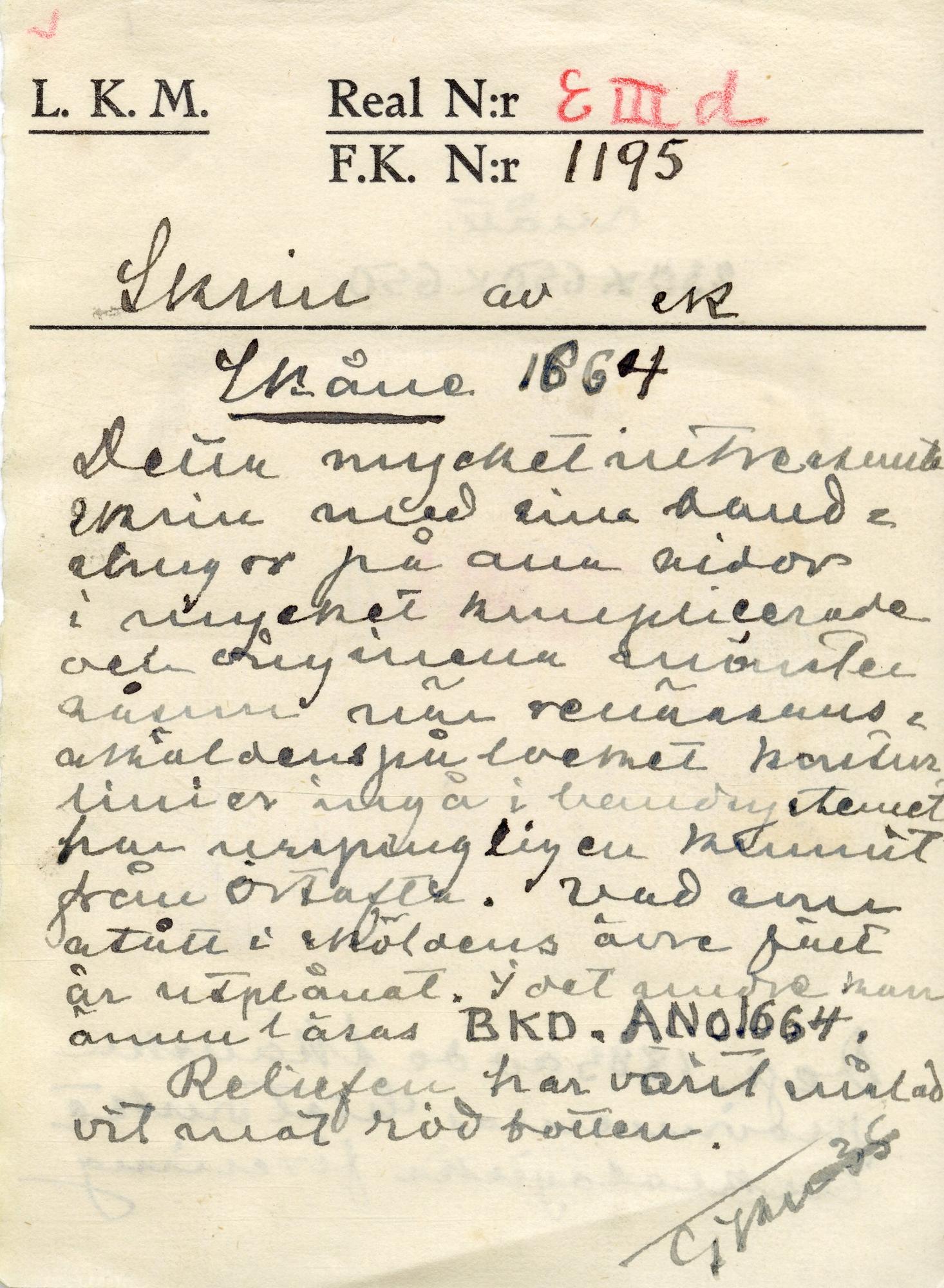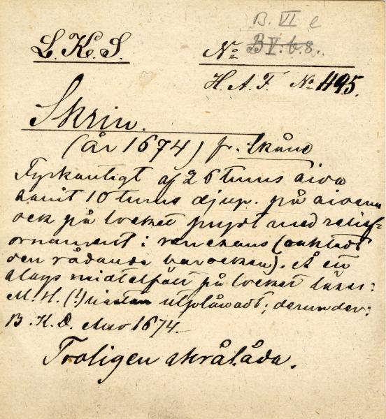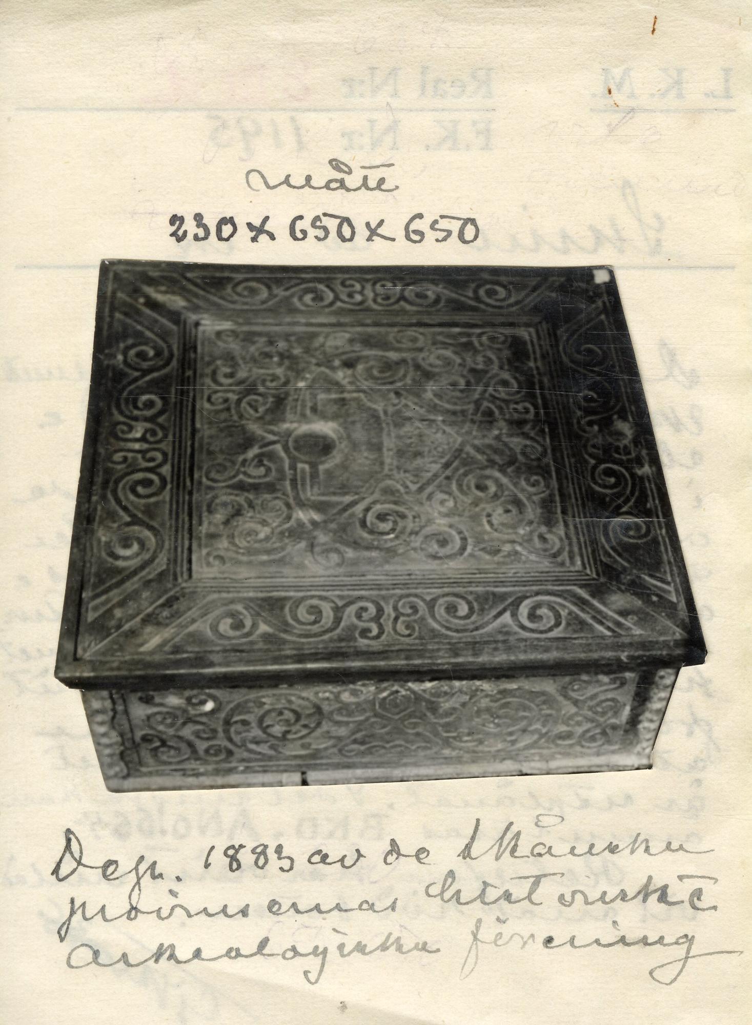 Skrin av ek Skåne 1664. Detta mycket intressanta skrin med sina bandslingor på alla sidor i mycket komplicerade och originella mönster såsom när renässanssköldens på locket konturlinier[sic!] ingå i bandsystemet har ursprungligen kommit från Örtofta. Vad som stått i sköldens övre fält är utplånat. I det undre kan ännu läsas BKD. ANO 1664. Reliefen har varit målad vit mot röd botten. Mått 230x650x650 Dep. 1883 av de Skånska provinsernas historiska o Arkeologiska förening [foto på katalogkortet]Stäng