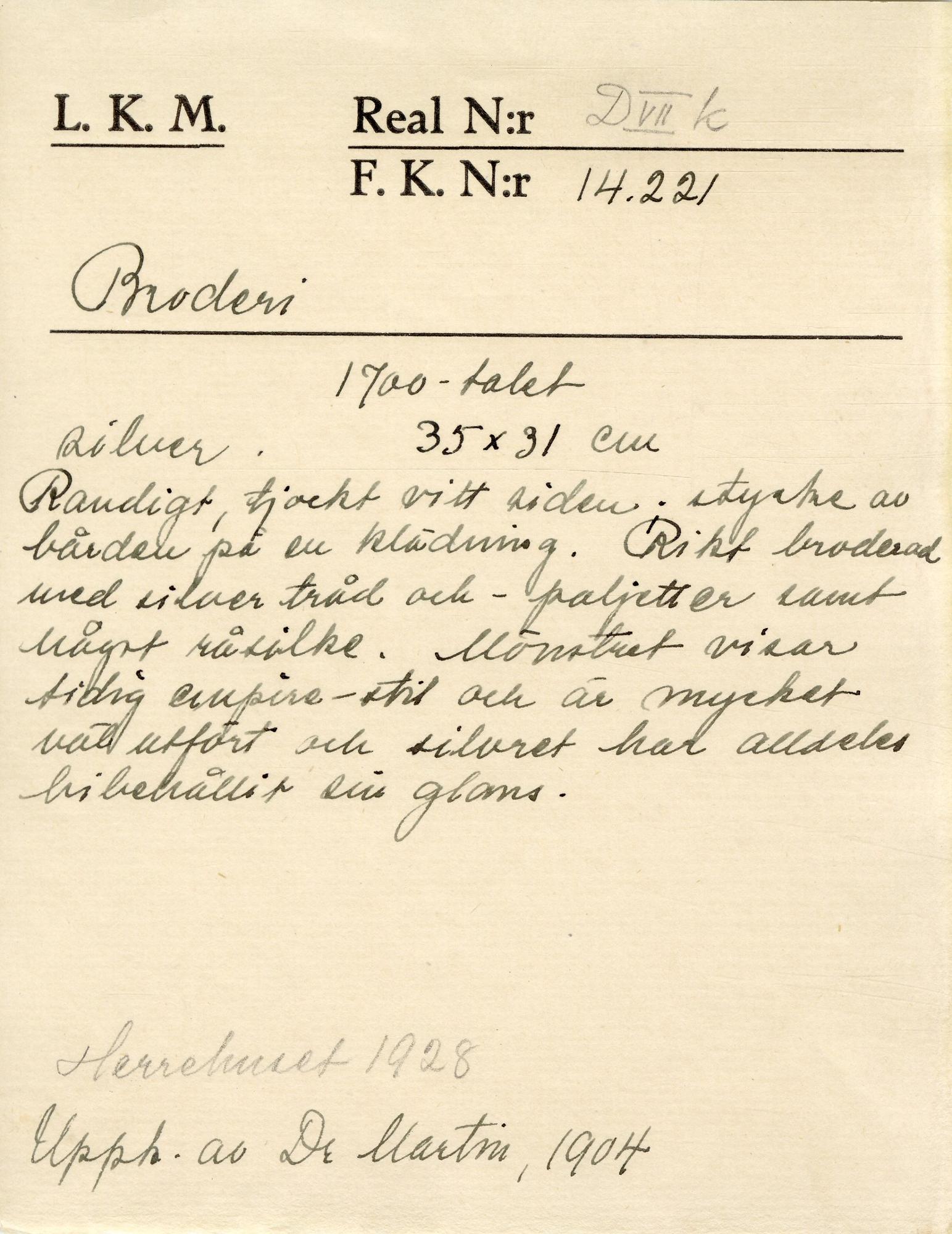 Utfört med silvertråd, paljetter och kantiljer på vitt, randigt siden. Randningen erhållen genom rips och atlas effekter. Stycket är invikt nertill och i övre vänstra hörnet som har spår av en söm. Bården börjar på vänster sida av bilden och fortsätter antagligen vidare åt höger. Det är svårt att bestämma på vad den suttit, men kanske på en klänning, som det står uppgivet i katalogen. Kontinentalt arbete. Tidig empire.