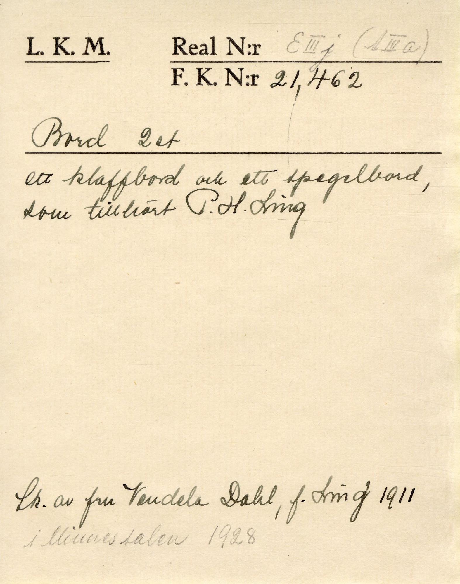 • Lingsamlingen: Föremålen KM 95777- KM 95809 ingick i Lingsamlingen vid Malmö idrottsmuseum. Merparten ägdes av Pehr Henrik Ling. Några av föremålen såsom porträtt av sonen Hjalmar Ling (1820-1886) och... Visa hela