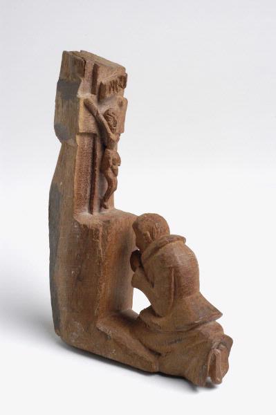 • Skulptur föreställande knäböjande kvinna framför krucifix, trä, 14 x 10 x 4 cm.