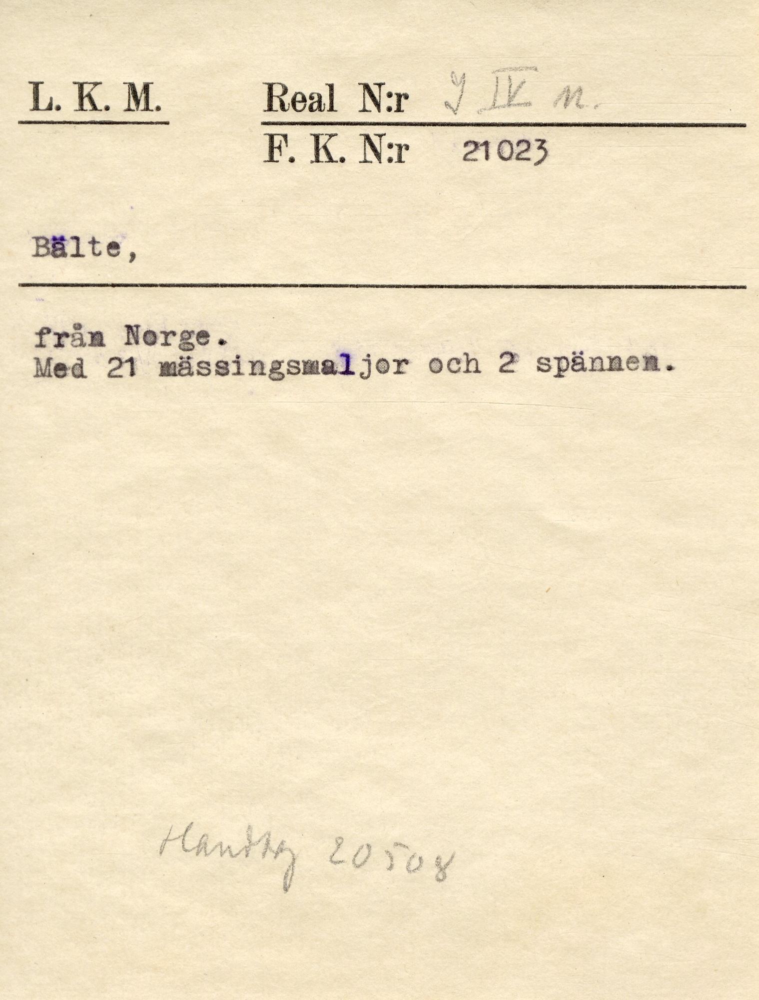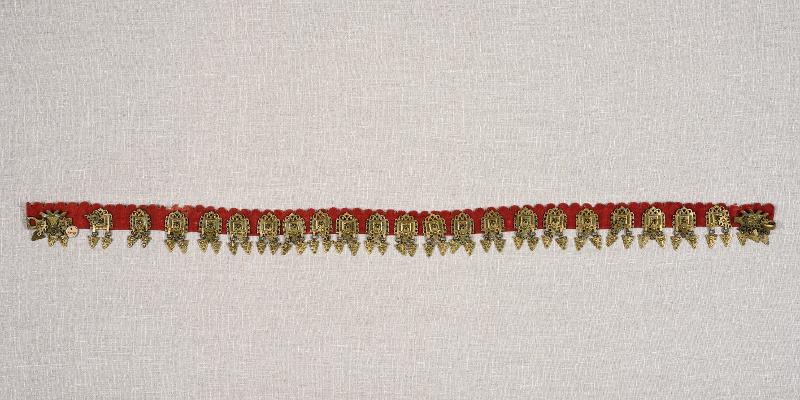 21 mässingsmaljor och två spännen. Röd uddad, tandad vadmal. Linnefoder. Maljorna sitter fast med en skinnsnodd som på skärpets insida är trädd genom öglorna. Kons. nr 813.1952