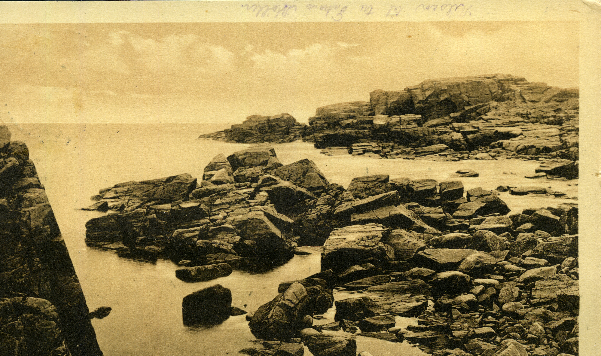 • Klippor och stenar i havskanten. Vit ram. Tryckt text "Parti från Houfs hallar"Adresserat till Fru Möller, "Villa Eber" (?), Birkeröd, Danmark