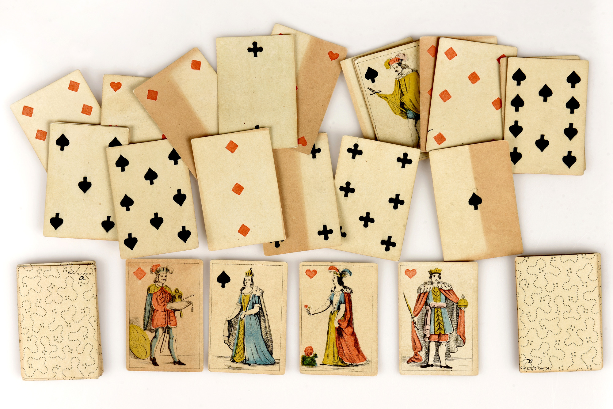 Patienskort. Ofullständig. Hjärter knekt, hjärter 9; Spader 6; Ruter kung och Klöver dam, klöver 6, 8-10 saknas. Figurerna rätstående. Stick i svart med färgtryck i rött, gult, blått och svart. Baksidan vit med ornering i grått av oregelbundna pricklinjer avslutade med tre punkter (samma som KM 14624) Teckning och tryck liksom baksidans ornering talar för Ca 1825-1850 som tillverkningstiden. De ...