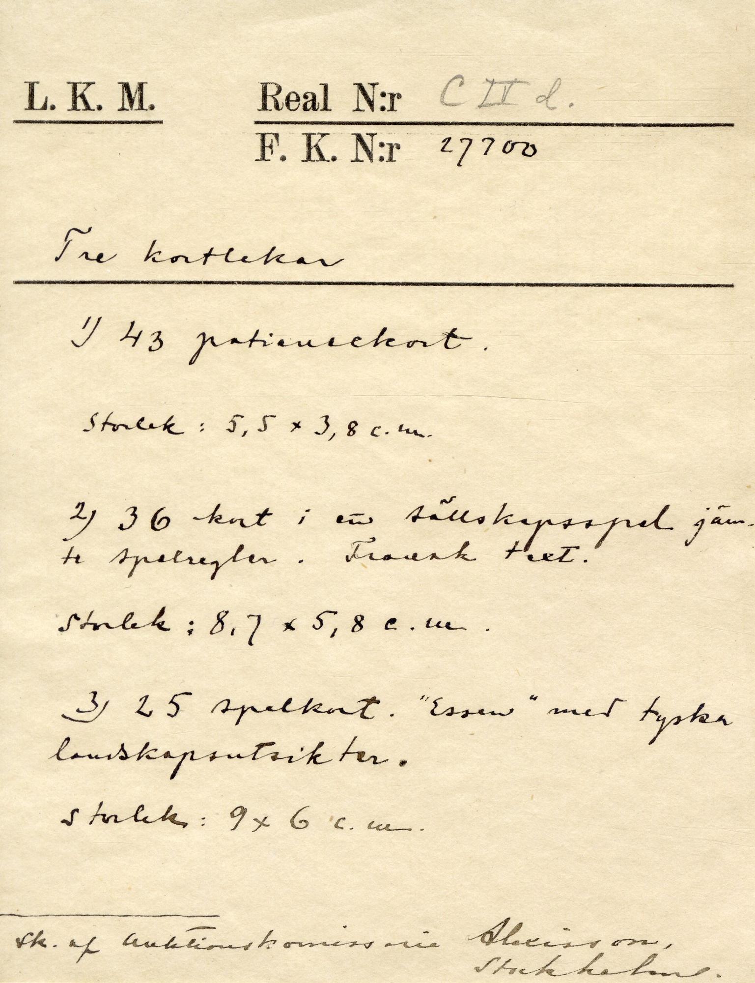 Patienskort. Ofullständig. Hjärter knekt, hjärter 9; Spader 6; Ruter kung och Klöver dam, klöver 6, 8-10 saknas. Figurerna rätstående. Stick i svart med färgtryck i rött, gult, blått och svart. Baksidan vit med ornering i grått av oregelbundna pricklinjer avslutade med tre punkter (samma som KM 14624) Teckning och tryck liksom baksidans ornering talar för Ca 1825-1850 som tillverkningstiden. De rätstående figurerna får då betraktas som en äldre kvarleva.