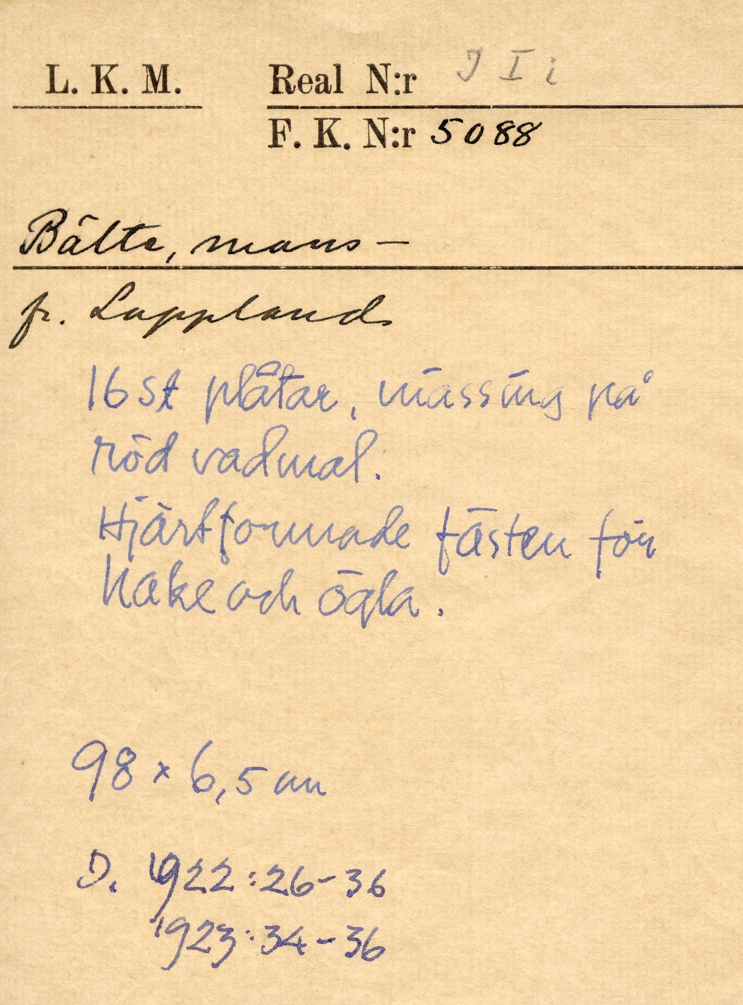 Uppköpt hos B. Sorgman, Lund 1890 . Tre samebälten. Detta bälte är troligen norskt möjligen skånskt. De runda skållöven är vanligast i Norge. Spännet är ett häktspänne i hjärtform och lämnar ej en hängande remände som är brukligt på samiska bälten. Spännet är ej gjutet och ej av det värde som samiska bälten brukar ha. Se Fjellström i Kulturens årsbok 1963 s 166-169.