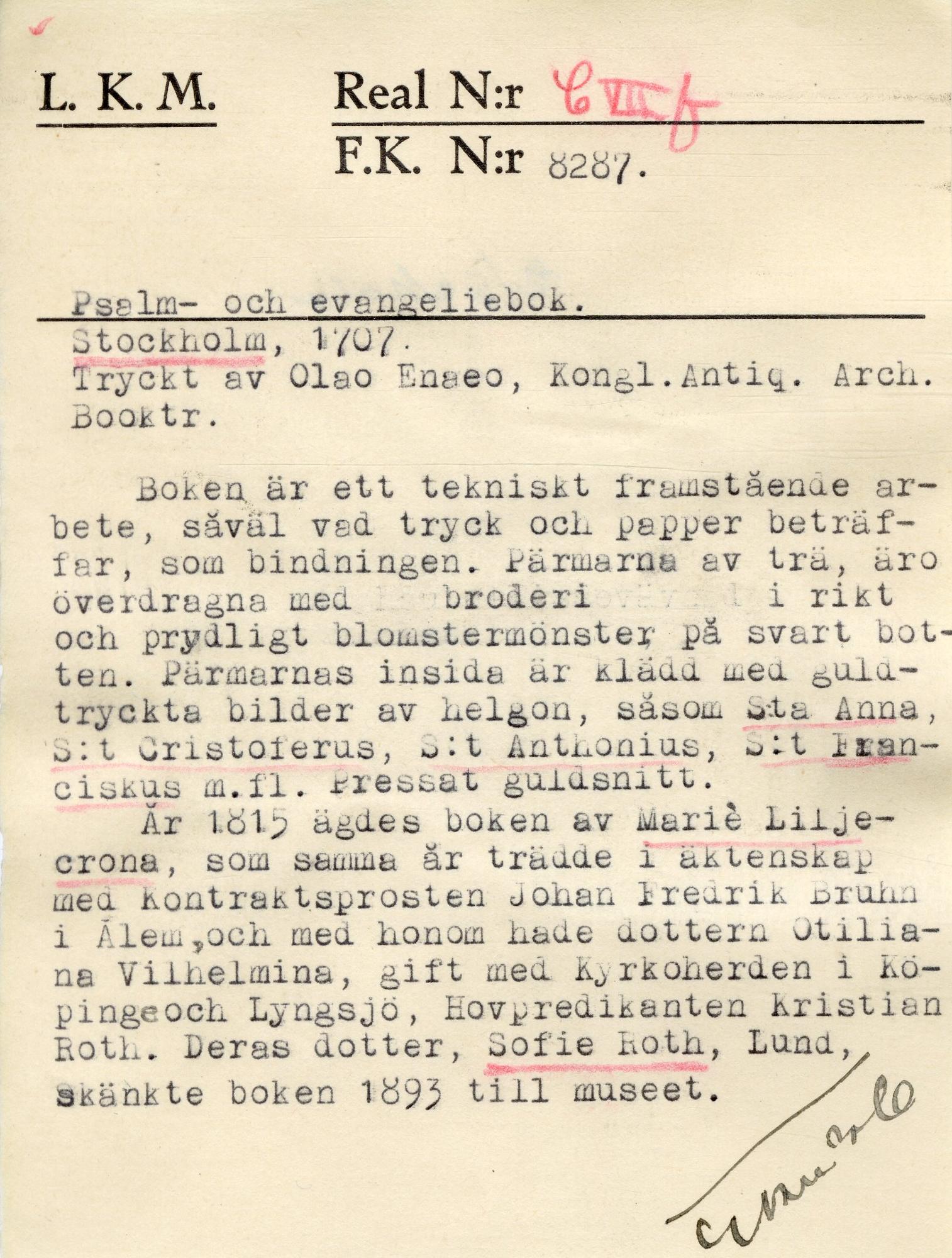 Ur Kulturens årsbok 1939: "Vårt bokband är utfört i petit point-broderi. Materialet är silke på stramlaj. Bladrankor och blomster äro hållna i färger, grönt, ljusrött, gult och blått mot svart fond. Stramlajen döljes helt, och stygnen äro tagna över endast en tråd. Arbetet är mycket omsorgsfullt utfört. Som så ofta på band av detta slag äro spännen och beslag numera borta. Tydliga spår märkas efter såväl hörnbeslag som i pärmsidornas mitt och spännen. Måhända ha de varit av silver eller åtminstone försilvrad metall. Snitten äro helt förgyllda med ciselering i bladkartuscher." W.K. [William Karlsson]Stäng