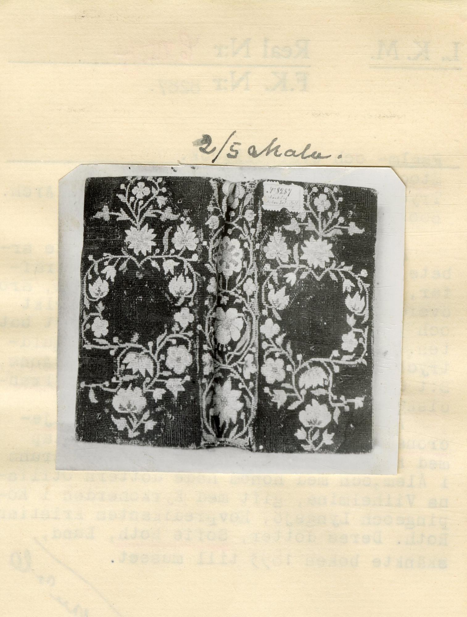 Ur Kulturens årsbok 1939: "Vårt bokband är utfört i petit point-broderi. Materialet är silke på stramlaj. Bladrankor och blomster äro hållna i färger, grönt, ljusrött, gult och blått mot svart fond. S...Visa hela