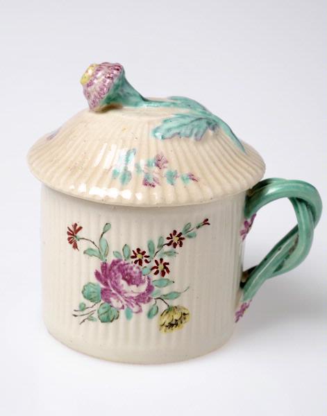 Rak med lodräta räfflor runtom. Grön stjälkliknande hänkel av två snodda delar. Kupat lock, räfflat med lockknopp i form av blommor med stjälk och blad. Målad dekor under och över glasyren i flera färger av blombuketter med bland annat en ros.