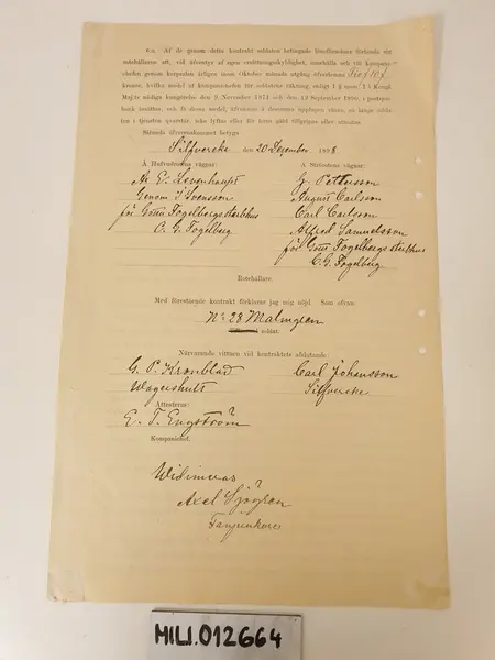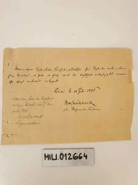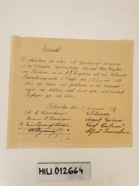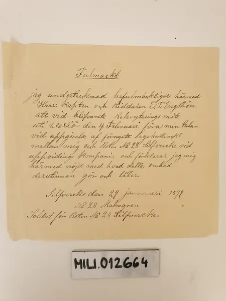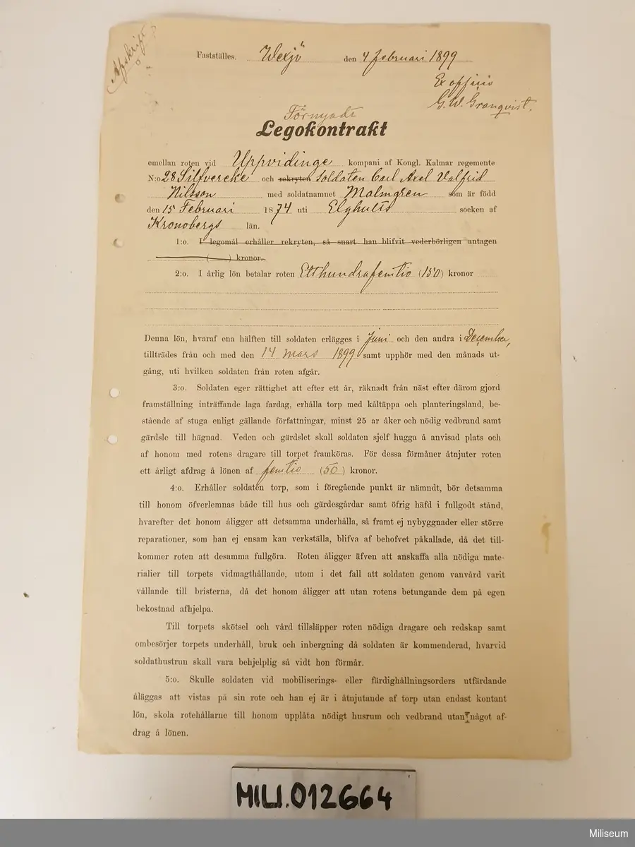 • Originaldokument (soldatkontrakt) för soldaten Carl Axel Valfrid Nilsson Almgren från rote nr 28 Silvereke (Älghults sn, Uppvidinge hd.), Uppvidinge kompani (6.), Kalmar regemente. 20 december 1898.