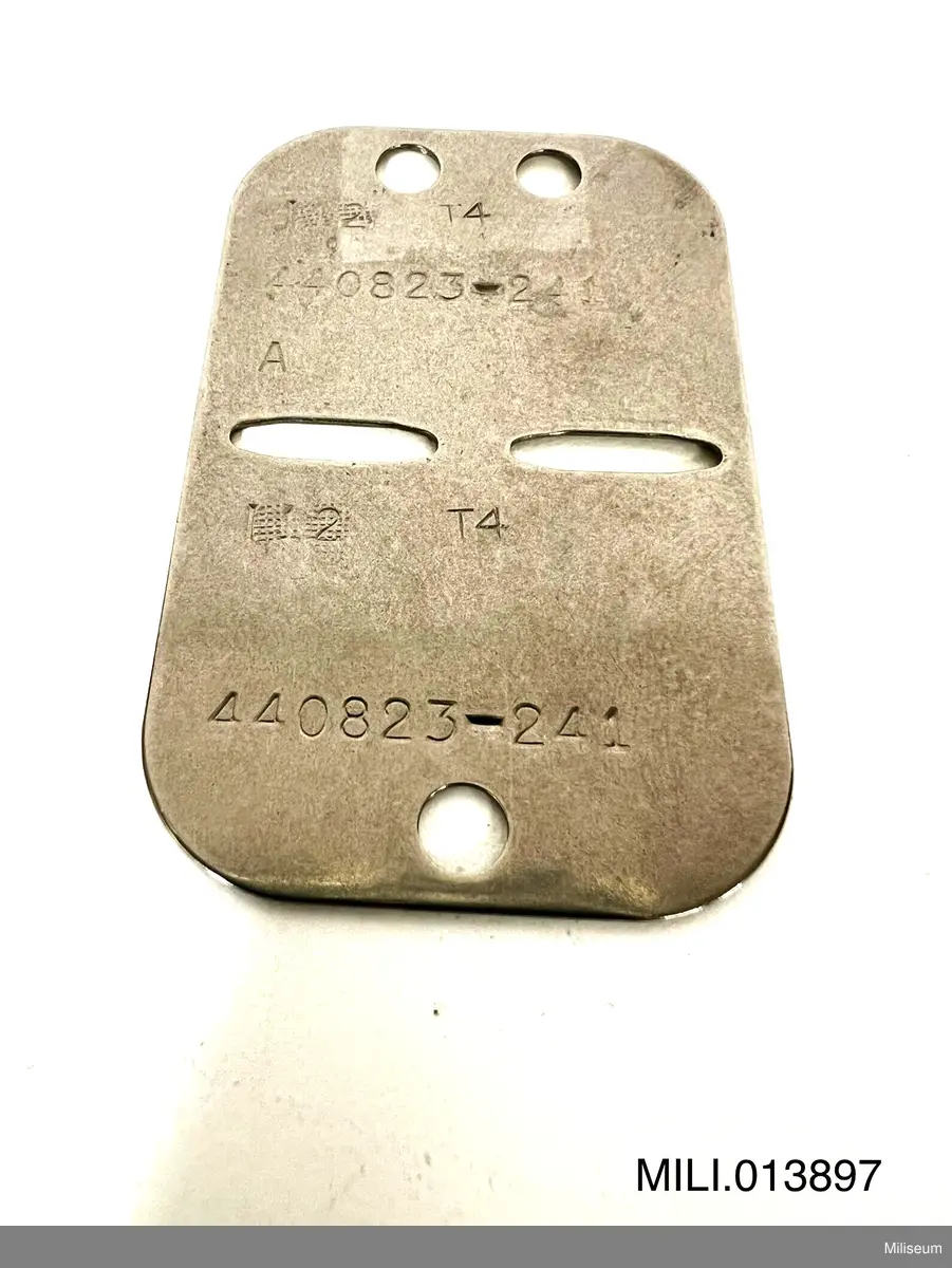 • Dödsbricka i och för värnpliktstjänstgöring, 1963. Utfärdad för Stig-Roland Johansson, Stengårdshult.