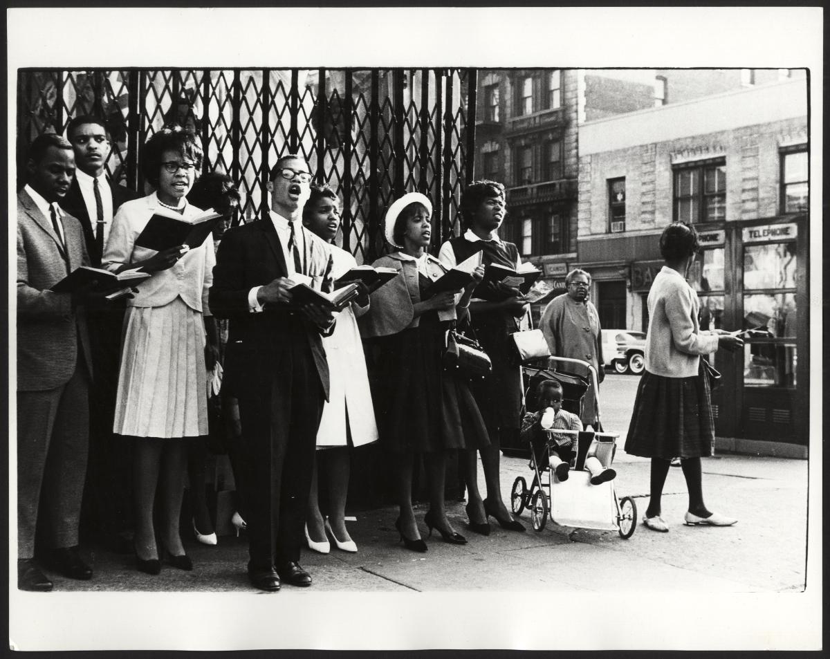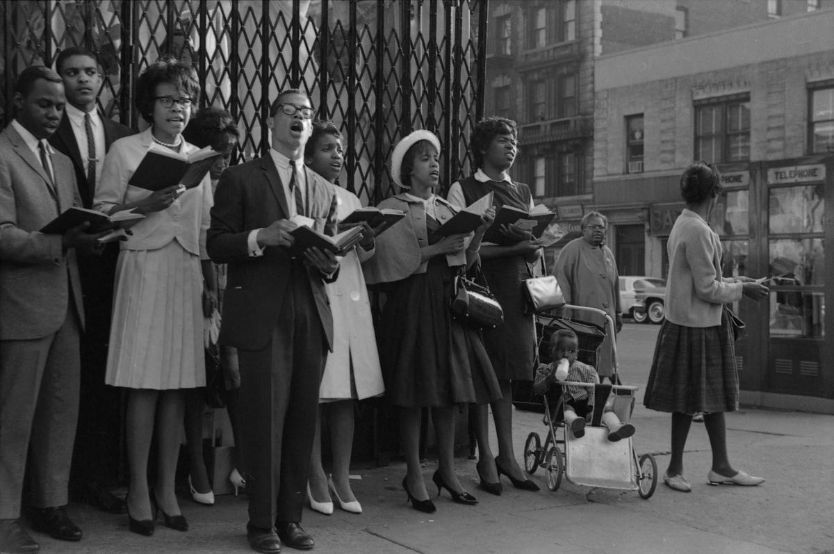 kör, man, körsång, byggnad, street photography, sång, kvinnor, gatuvy, sångbok, telefonkiosk, byggnader, fasad, barn, människor, harlem, husfasad, kvinna, fönster, new york, barnvagn, män