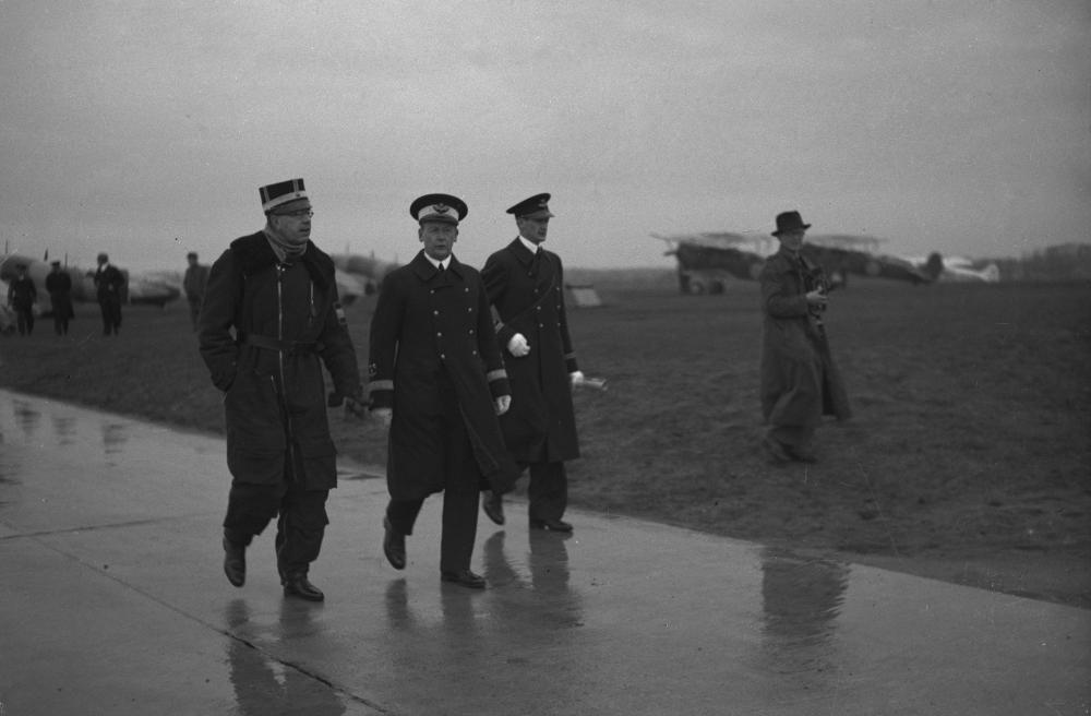 Utomhusbild som visar kung Gustaf VI Adolf på officersexamen i Ljungbyhed den 14 april 1939. I bakgrunden syns flygplan. (Han blev inte kung förren 1950) Texten i liggaren stämmer således ej överens med bilden. CS/Regis