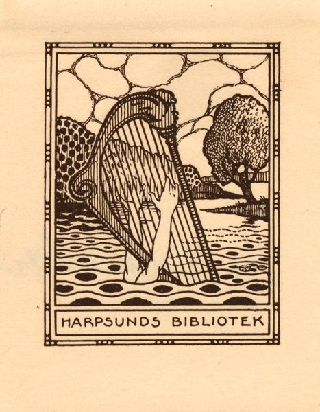 • Brunt tryck på vitt papper. Landskap och harpa.