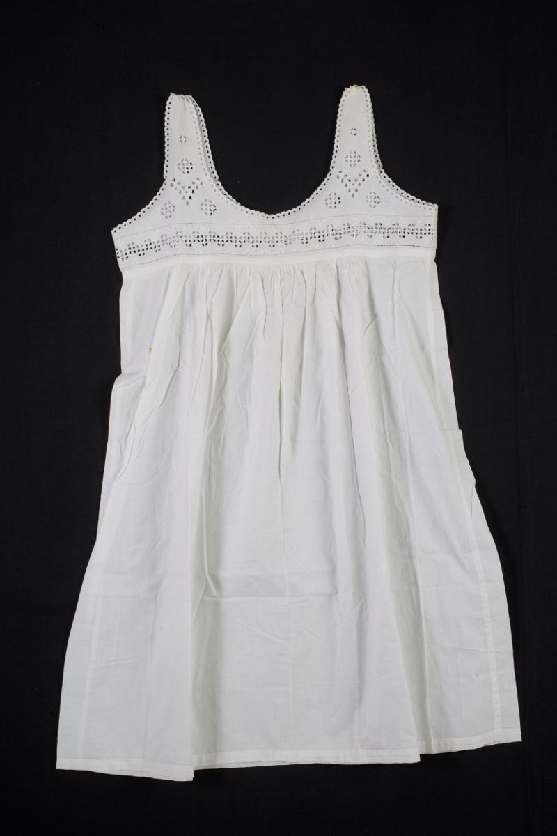 • Linne med överdel av brodyr. .Rund halsringning och axelband . Knäppning med linneknapp på axeln.