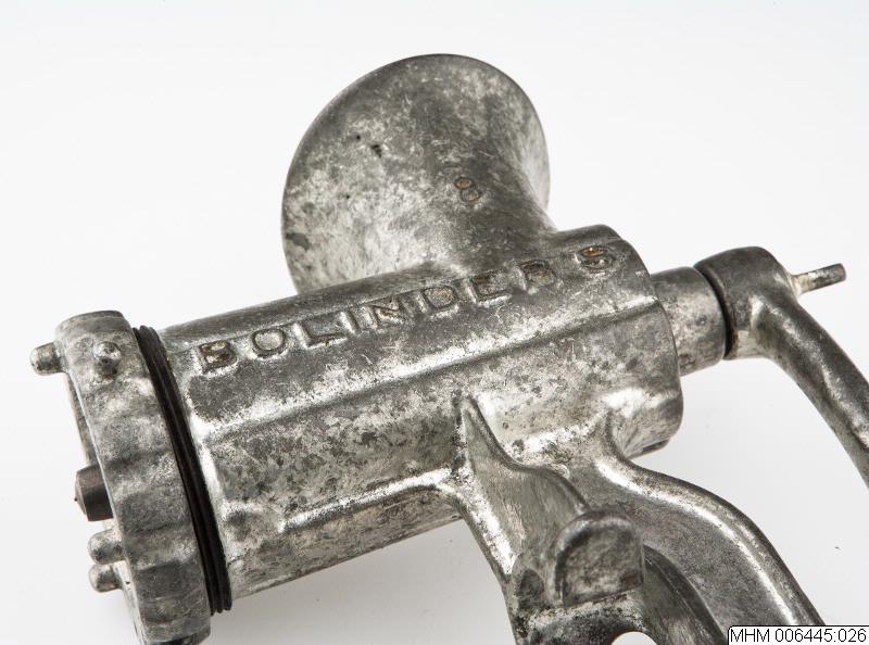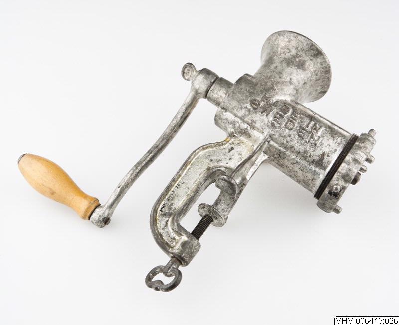 Köttkvarn av gjutet järn med cylinderformad trumma i vilken löper en spiralformad skärare som avslutas med fyra vinkelrätt satta knivblad. Drivs av en vev med träklätt handtag fastsatt i ena änden. Ovanpå trumman en uppdragen oval öppning där man stoppar ned köttet. I andra änden av trumman sitter en löstagbar perforerad rund skiva som hålls fast med en gängad ring. Gjutet i ett stycke med trumman...Visa hela