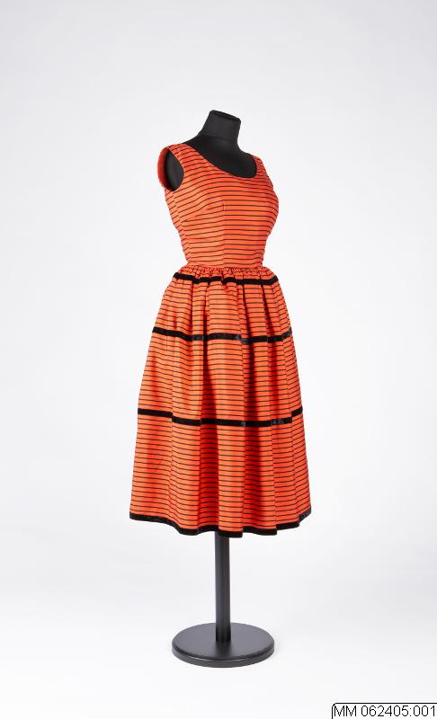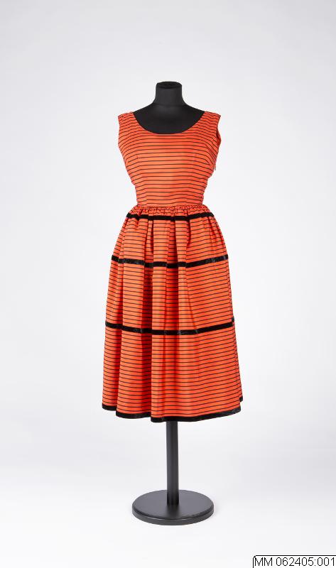 • Klänning utan ärm av svartrandigt konstsiden. Figursydd överdel och vid rynkad nederdel. Dragkedja i sidan. Tre rader påsydda tvärgående svarta sammetsband. Infodring av smalrandigt konstsiden