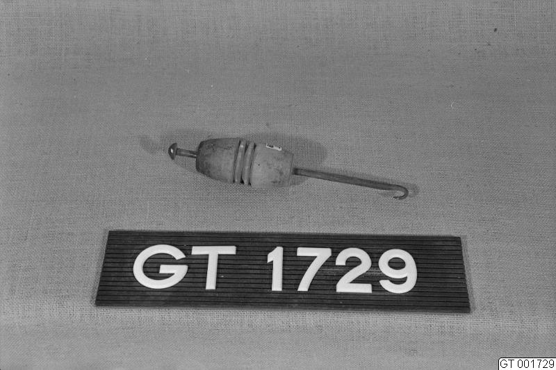 Tvinnhuvud för snörtillverkning. Avlång, svarvad träkloss med genomborrat hål på längden, i vilket sitter ett tunnt rundjärn med stort, platt huvud i ena änden och krok i den andra.
