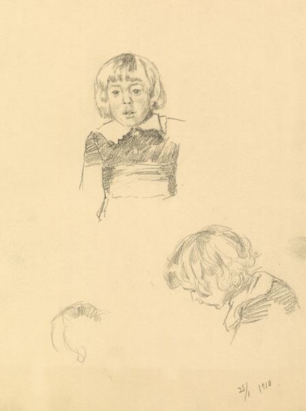 Bilden visar två skisser av en pojke i fem-, sexårs-åldern. Den ena skissen avbildar honom framifrån och den andra från sidan. Pojken har ljust, tvärklippt hår med lugg och är klädd i mörk blus/jac- ka med vit krage. Om midjan har han ett brett band. Profilskissen är enklare utförd än den andra skissen, och det är inte helt säkert att den avbildar samma pojke, men troligtvis är det så.