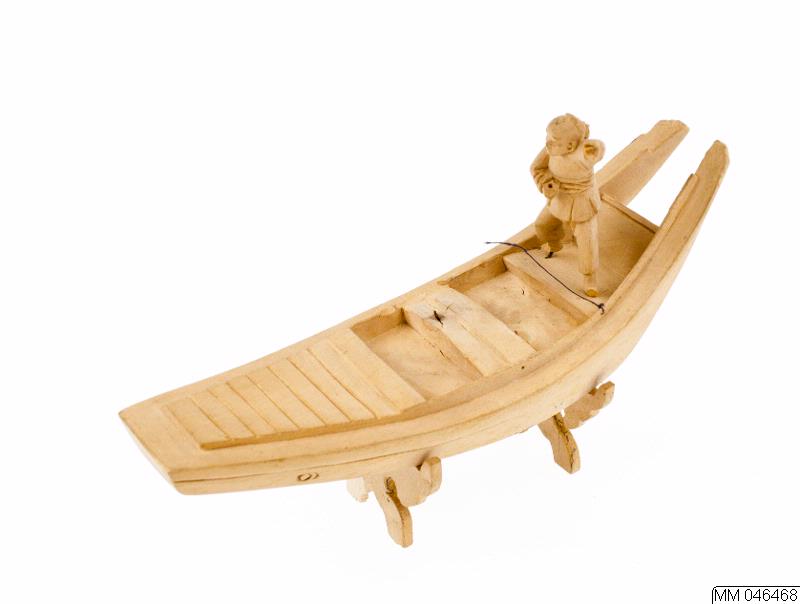 • Skulptur av fruktträ och bambu. Föreställande båt (s k san-pan) med roddare.
