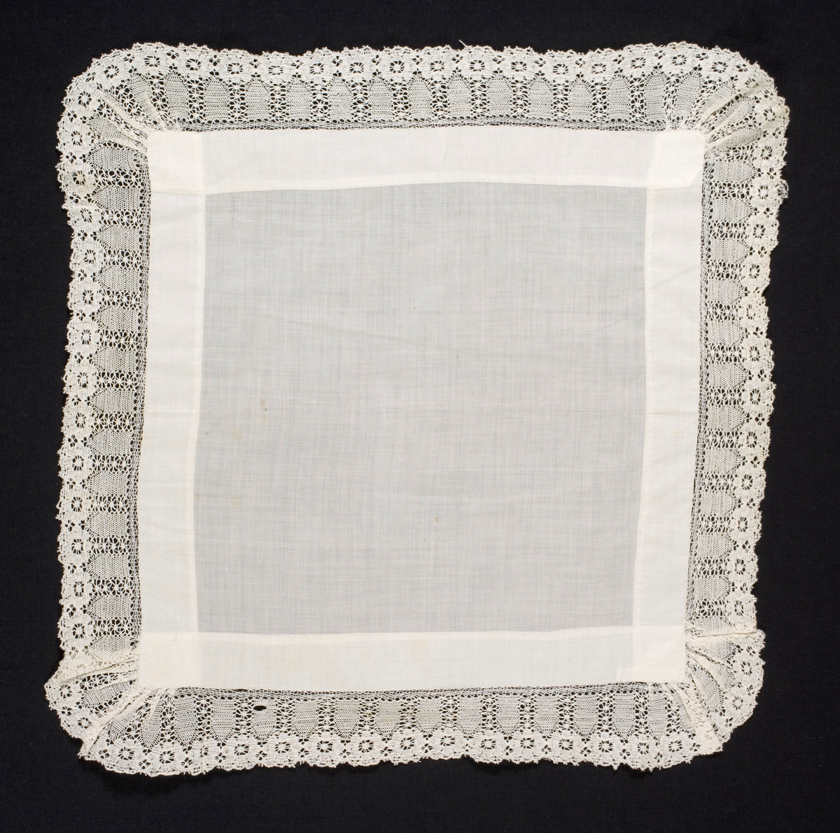Näsduk i vit bomullsbatist.Kantad med maskinknypplad, vit spets (ca 4,5 cm bred).