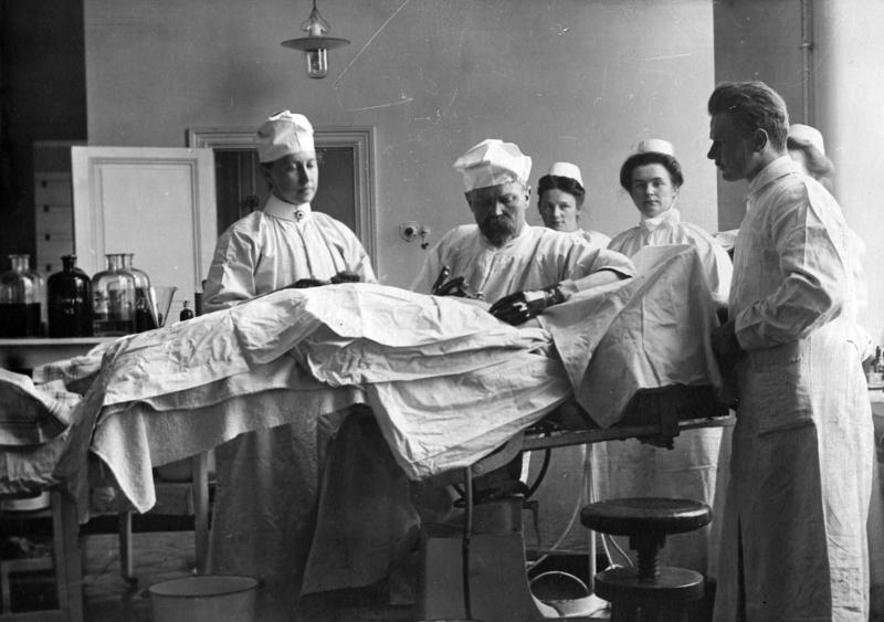 Operationssal på Akademiska sjukhuset Uppsala 1906. Professor Lennander, doktor Levi Bergström, Syster Anna Myrsten, Syster Elin Axell, Syster Agnes Grip, Syster Elin ?. Namnen ovan är nedskrivna av prof Gunnar Nyström. F.ö.se Sv. Läkarsällsk, Handl. Bd 26 1955 Häfte 2, sid 52.