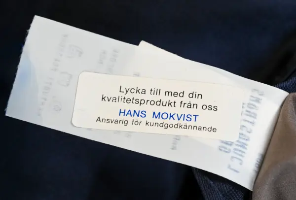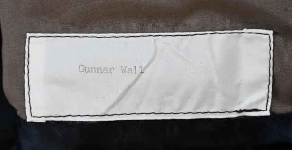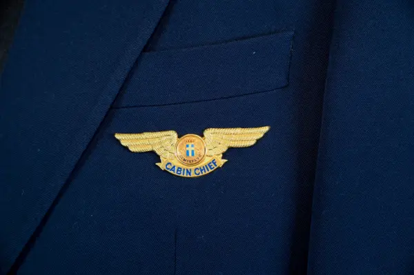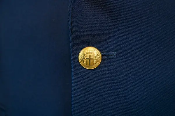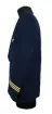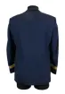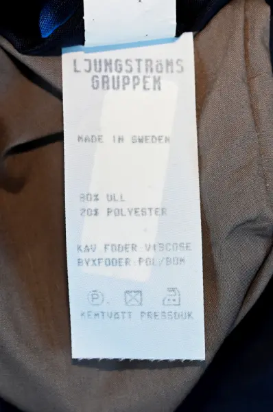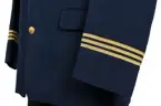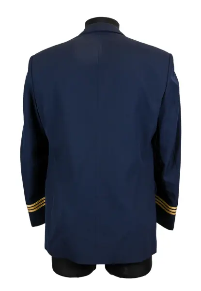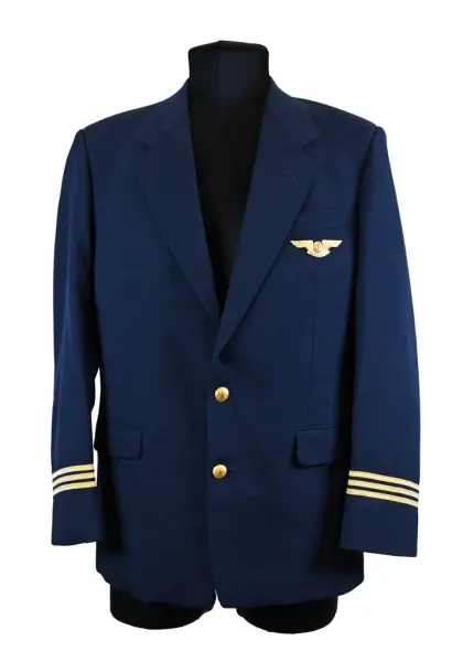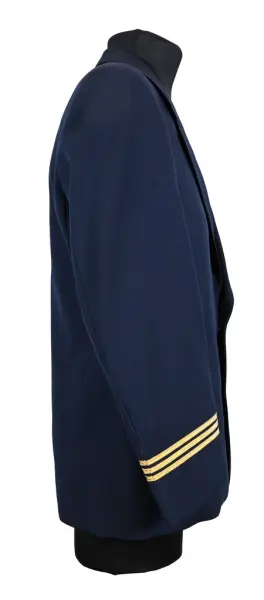 Kavaj i herrmodell , uniform för flygbolaget Linjeflyg. Mörkblå av 80% ull och 20 % polyester. Enkelknäppt med två knappar fram i guldfärgad metall. På bröstfickan på vänster sida metallmärke Cabin Chief med svensk flagga och ett par utbredda vingar. På ärmsluten 3 guldgaloner i rad.