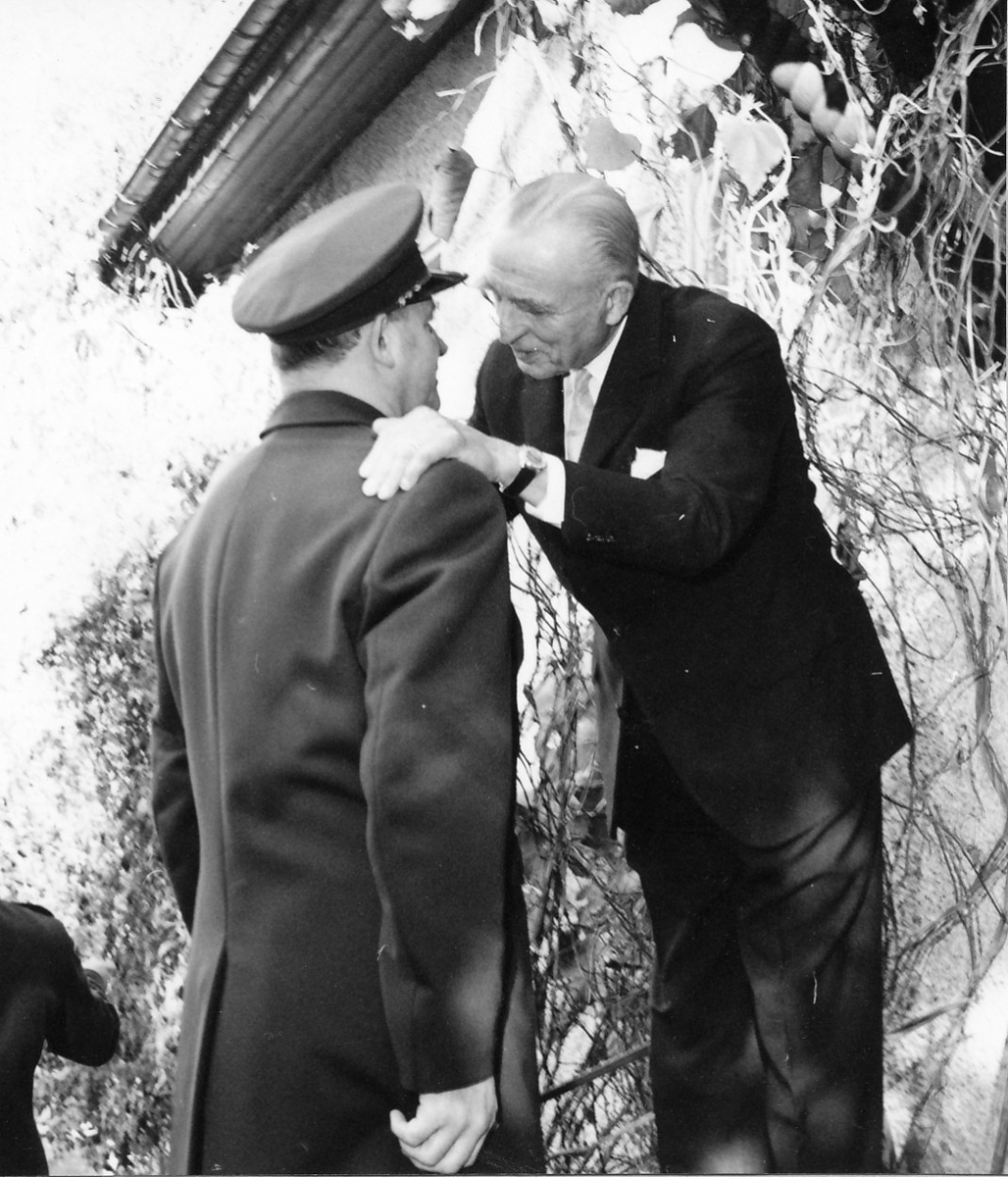 Jubilaren, rörd och glad över hyllningen, hälsade var och en varm välkomna in till kaffebordet. OBS. 3 bilder Bild 1: Frv förvaltare Erik Johansson och överste Erik Cavalli. Bild 2: Frv. tekniker Lar...