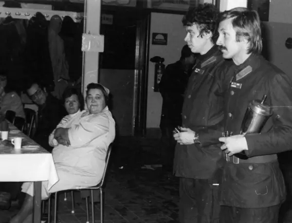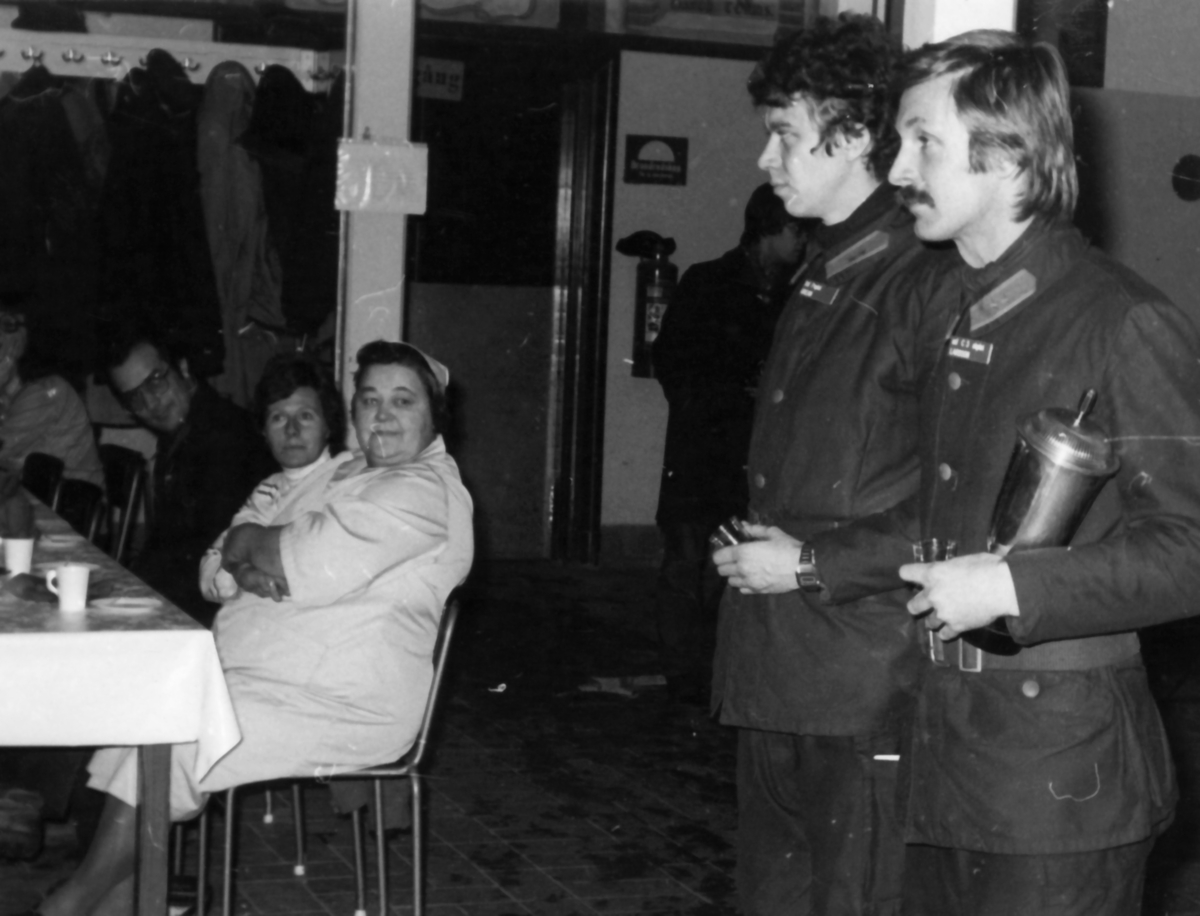 Personalsamling den 19 december 1978 Idrotts- och skytteverksamheten vid regementet har stor bredd, men också en spets som regelbundet hämtar sina priser. Här ser vi löjtnanterna Göran Grehn och Bengt-Erik Larsson med nya "bucklor". Vid bordet ser vi också föreståndarinnan för Mälarmässen -- Frida Karlsson.