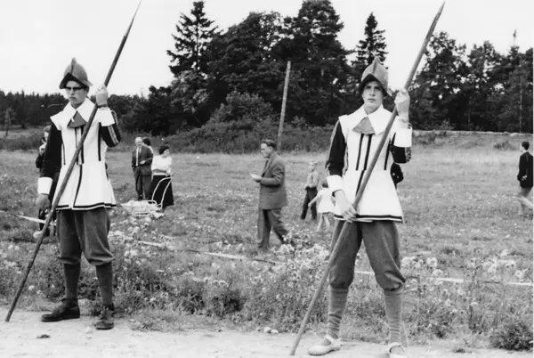 Bild 2: Uppvisning av äldre uniformstyper. Upp mot skogsdungen ser vi tvåhundrametersvallen.