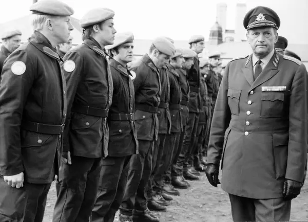 Bild 1 Ut från kanslihuset kommer arméchefen general Carl-Erik Almgren, överste Karl-Gustav Norderup Ast/FN, överste Stig Colliander och standarförare (ur P 10/Fo 43) löjtnant Lars Liljenstolpe.