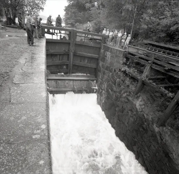 Orig. text: Dykare vid Hackefors sluss (Corren).Kinda kanal öppnades som farled 1871 och certifierades året därpå.