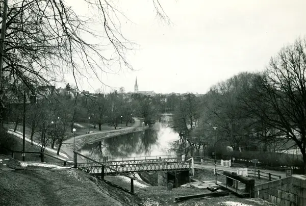 Orig. text: Utsikt från Tannefors sluss.Kinda kanal öppnades som farled 1871 och certifierades året därpå.