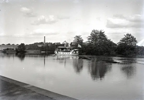 Orig. text: Passagerarbåten Maria lämnar hamnen i Linköping. I bakgrunden syns skorstenarna vid Kallerstad tegelbruk.