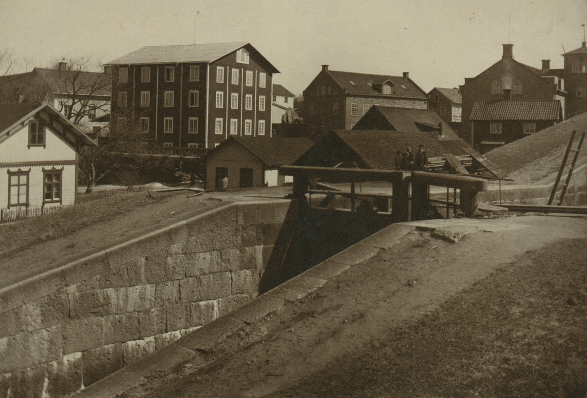 Tannefors slusstrappa sedd nedifrån med flertalet byggnader. Kinda kanal öppnades som farled 1871 och certifierades året därpå.
