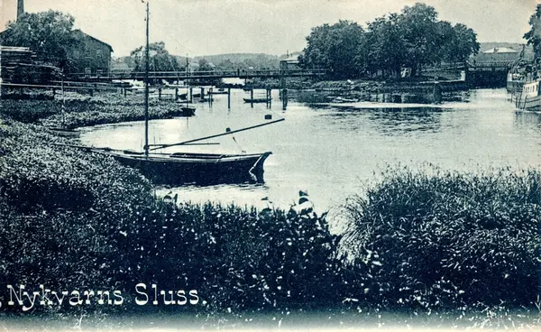 Bildtext: Nykvarns Sluss.Båtar kring slussen vid Nykvarn. Kinda kanal öppnades som farled 1871 och certifierades året därpå.