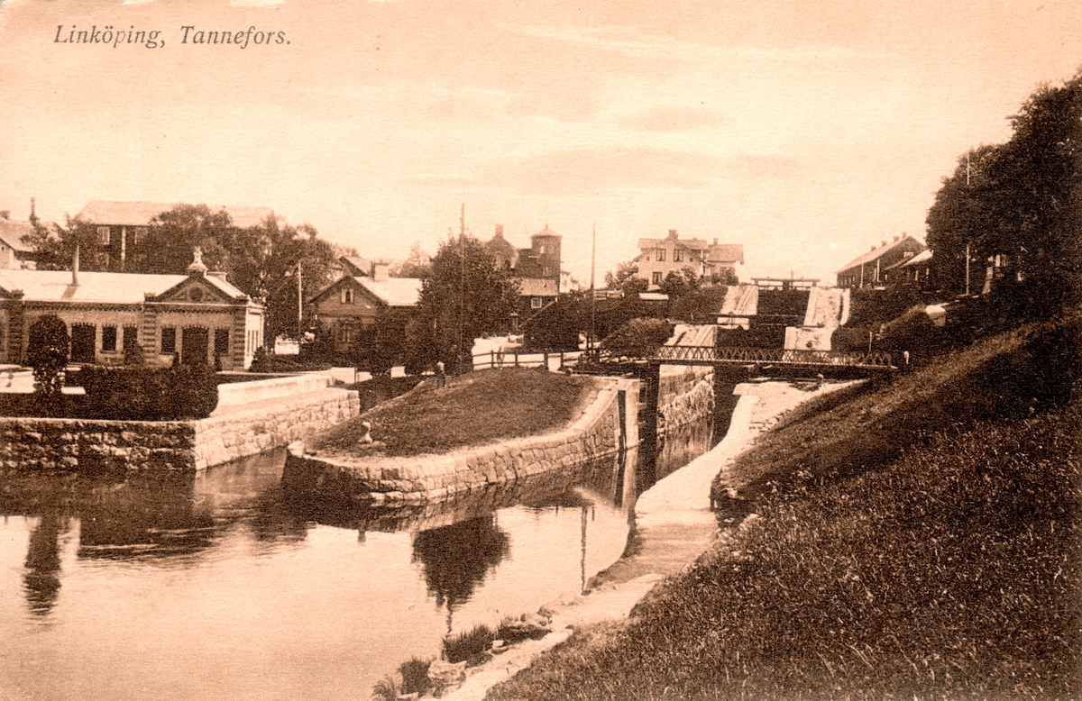 Bildtext: Linköping, Tannefors. Tannefors sluss. Vattenverket vänster i bild. Kinda kanal öppnades som farled 1871 och certifierades året därpå.