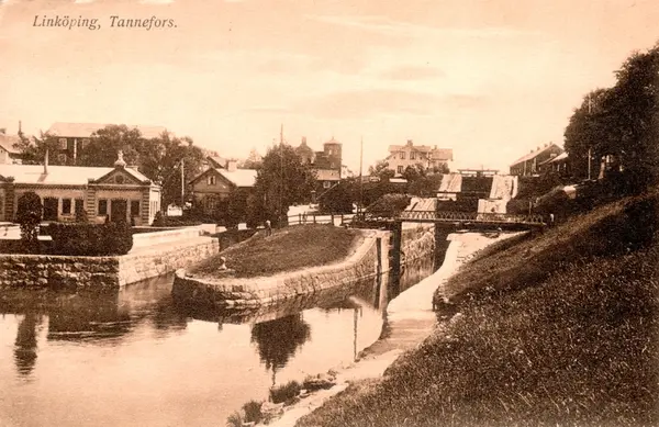 Bildtext: Linköping, Tannefors.Tannefors sluss. Vattenverket vänster i bild. Kinda kanal öppnades som farled 1871 och certifierades året därpå.