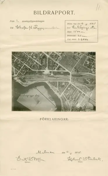 • Bildrapport från flygspanarskolan på Malmen, 13/5 1925. Rapportblad om spaning med påklistrat flygfotografi.
