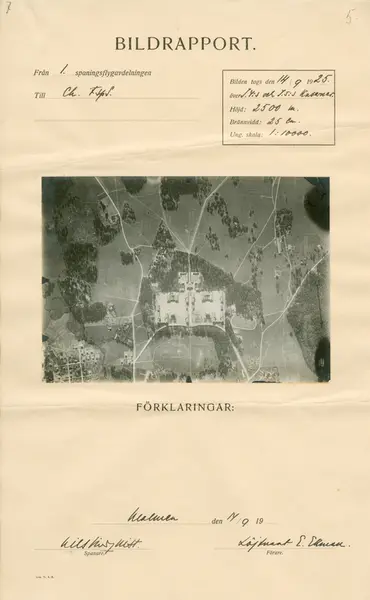 • Bildrapport från flygspanarskolan på Malmen, 14/9 1925. Rapportblad om spaning med påklistrat flygfotografi.