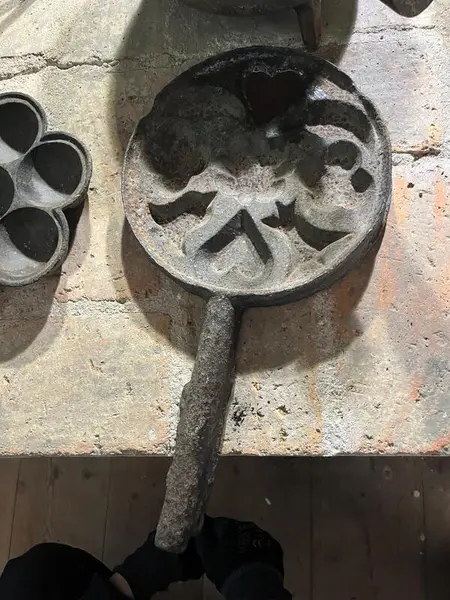 • Munkpanna av gjutjärn. Med nio fördjupningar i form av hjärtan, halvmånar mm.