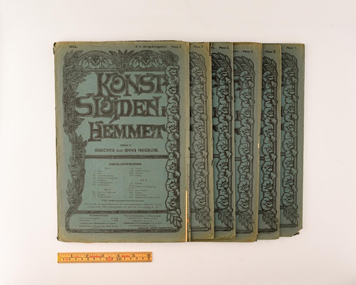 • "Konstslöjden i hemmet", 3:e årgången. Sju stycken tidskrifter innehållandes mönsterblad. Utgivna av Gustava och Anna Meukow år 1906. 21,5x32 cm. Varje tidskrift består av en mapp av blått papper som ... Visa hela