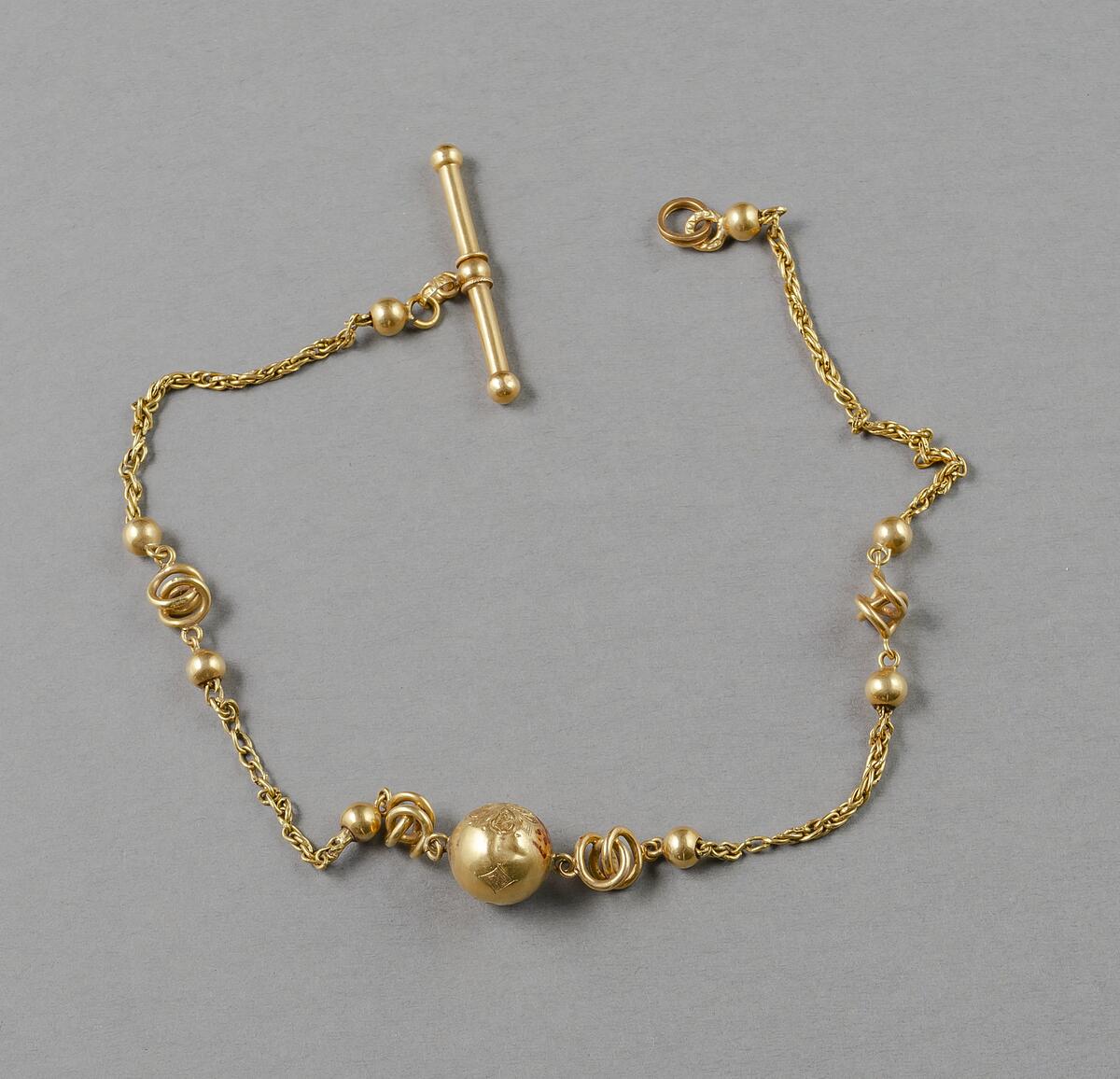• AV GULD, MED VRIDNA LÄNKAR OCH KULOR, PÅ MITTEN STÖRRE GRAVERAD KULA. L. 31,5 CM. FRÅN KV. TRANKOKET, TRANHUSGATAN 42, VISBY. HAR TILLHÖRT GUSTAVA ELLER ANNA MEUKOW ? DNR: 42/47.