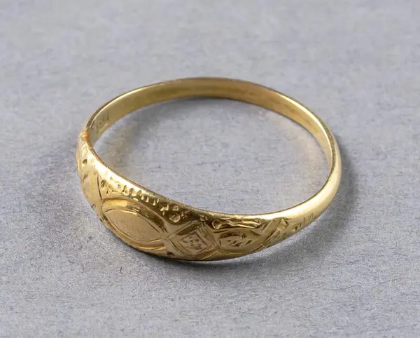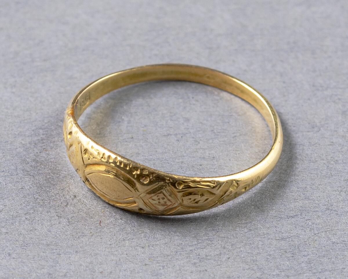 AV GULD MED SVAGT DRIVEN DEKOR PÅ FRAMSIDAN I TUNNT BLECK. STPL: 3 kr. 18 KARAT S 5, OTYDLIG MÄSTARSTÄMPEL MED TRE BOKSTÄVER (SVENSKT ARBETE 1872). DIAM. 1,8 CM. TILLHÖRT GUSTAVA ELLER ANNA MEUKOW