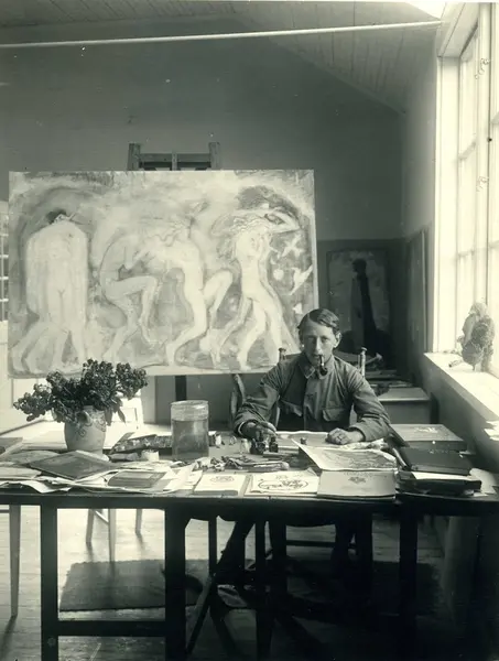 - Konstnären John Bauer i sitt arbetsrum i sin ateljé i Villa Björkudden, Bunnström öster om Gränna.